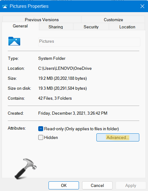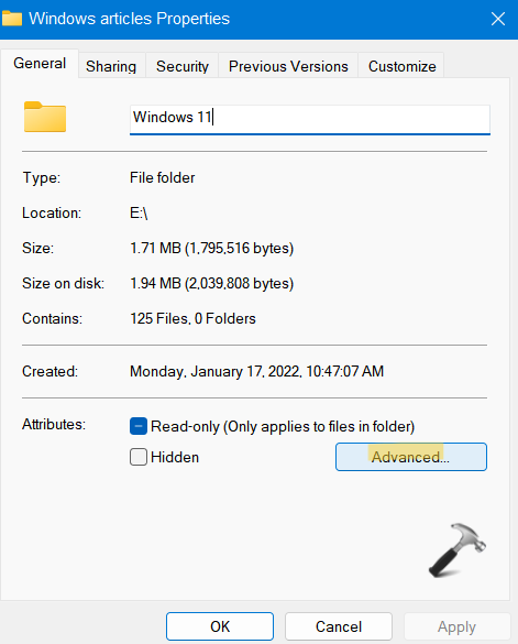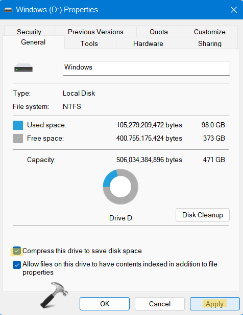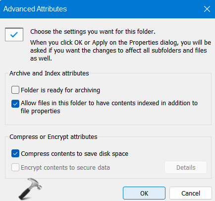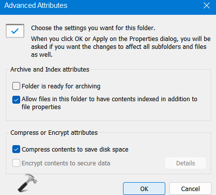 3.Ardından, yanında bulunan kutuyu kontrol edinDisk alanından tasarruf etmek için içeriği sıkıştırın. Sonra basınTAMAM.