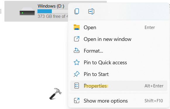 1.İlk olarak, sıkıştırmak istediğiniz sürücüye sağ tıklayın. Şimdi seçinÖzelliklerBağlam menüsünden sekme.