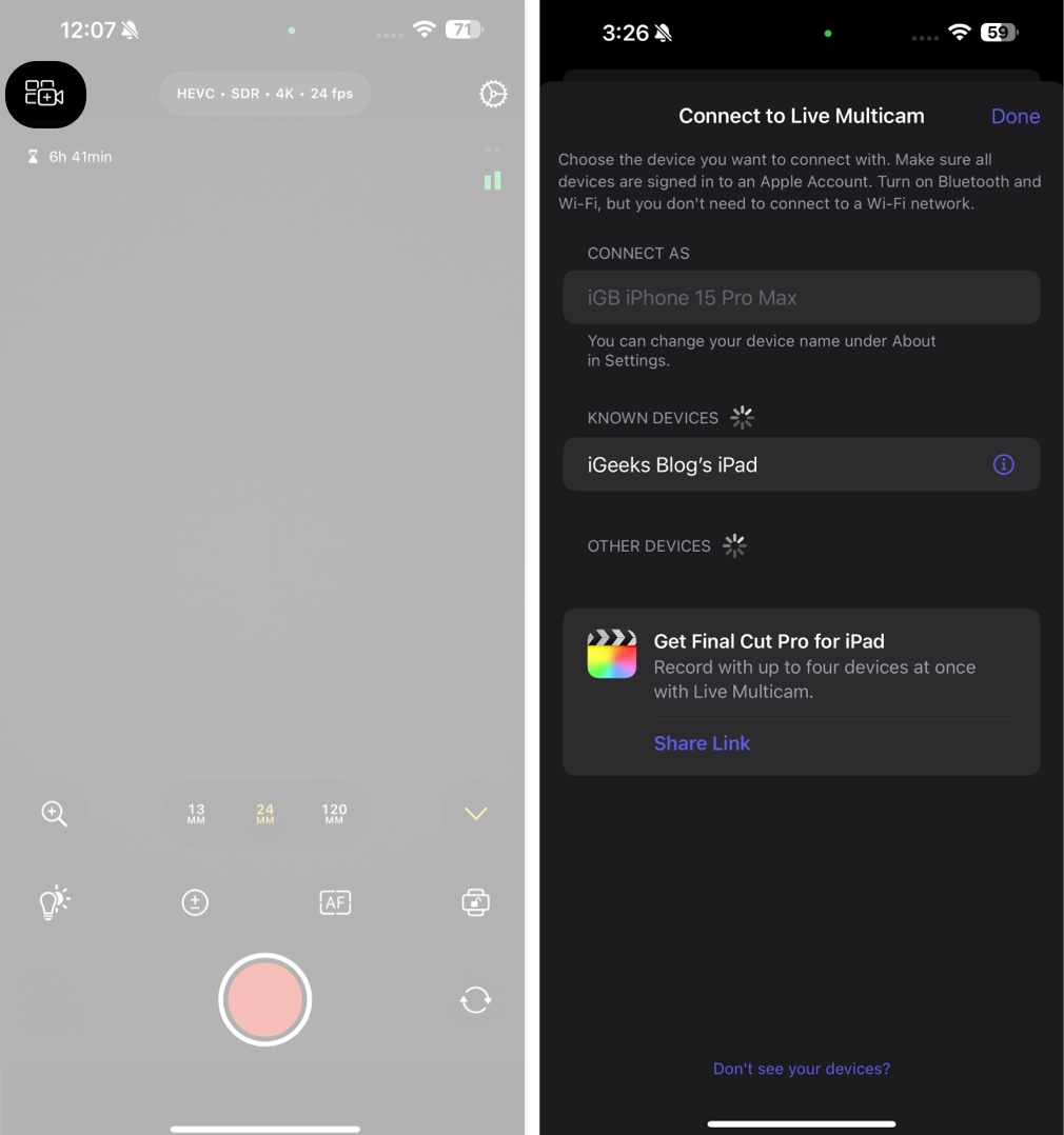 Aynı anda dört adede kadar farklı Apple cihazından videoları kaydetmek için Canlı MultiCam özelliğini kullanabilirsiniz. Bunu yapmak için,çokEkranın sol üst köşesinde simge. Bu özelliği kullanmak için Final Cut Pro uygulamasını çalıştıran bir iPad'e sahip olmanız gerektiğini unutmayın. Ayrıca, tüm kayıt cihazları yakınlarda olmalı ve son kesilmiş kamera uygulaması açıkken aynı Apple hesabına oturum açmalıdır.