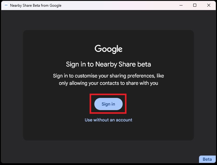 Not:Google hesabınıza giriş yapmadan PC'nizdeki yakındaki paylaşımı kullanabilirsiniz, ancak bunu seçerseniz, paylaşım tercihlerini özelleştirme ve ekranınız kapalı olsa bile dosyaların otomatik olarak kabul edilmesi ve aktarılması gibi özelliklere erişemezsiniz.