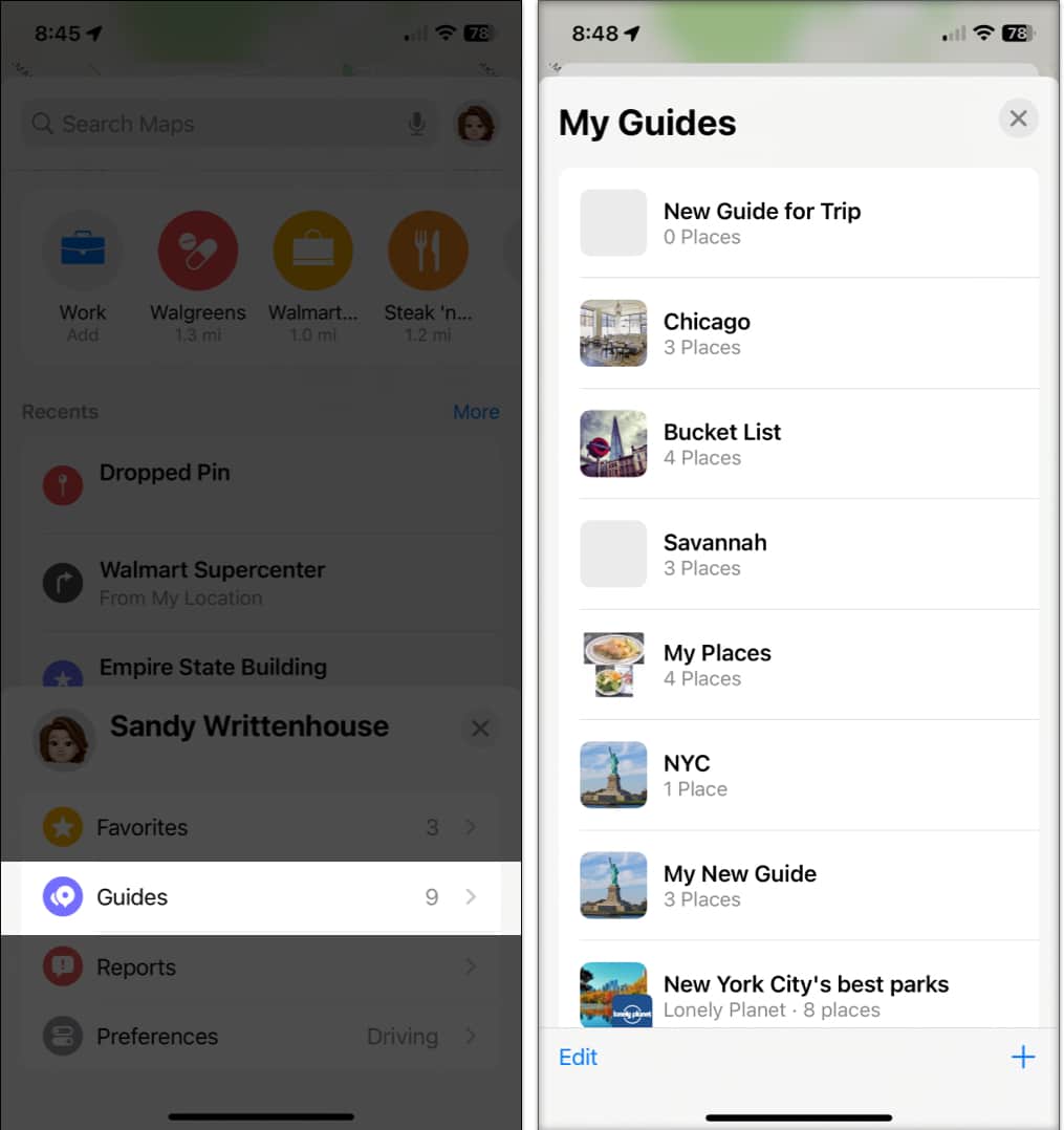 Daha sonra erişmek için,Rehberlerimekranın altındaki veyaRehberlerprofilinizin bölümü. Daha sonra, haritadaki ayrıntılarıyla birlikte görmek için eklediğiniz bir yer seçebilirsiniz.