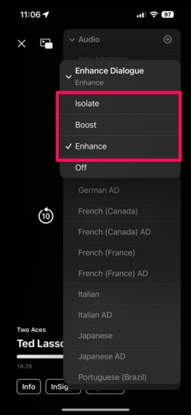 Geliştirme Diyalog özelliği esasen arka plan müziğinin hacmini azaltır ve izleyicilerin diyalogları her zamankinden daha net duymasına izin vermek için bir sahnedeki konuşma hacmini artırır. Bu nedenle, kullanıcılar, iPhone'daki Apple TV uygulamasında en sevdikleri film veya TV şovunun tadını çıkarırken, bir sahnede aktörlerin diyaloglarını karıştırarak kulak basma arka plan puanları yaşamayacaklar.