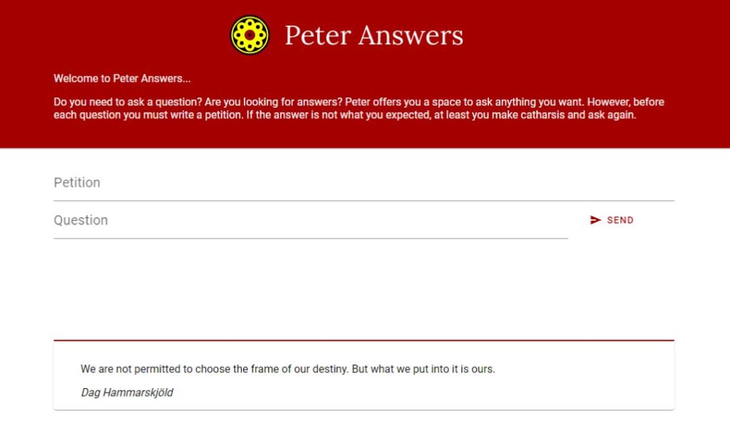 Peter Answers (Ask Peter olarak da bilinir), sanal tarot sitesi olarak sunulan bir web sitesidir. Normalde, sanal tarot siteleri, geleceğinizi anlatmak için tarot kartlarını kullananlardır. Tek yapmanız gereken, gelecek hakkında bilmek istediğiniz bir soru yazmak ve Peter size sorunuzun cevabını verecektir.