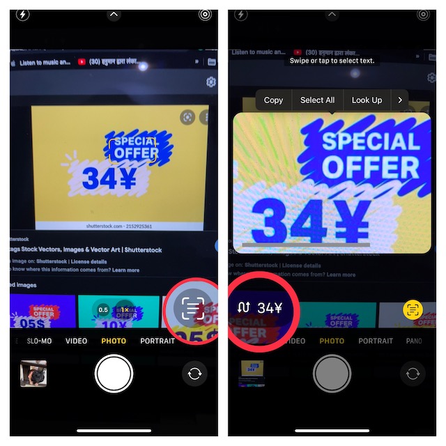 3.Kamera, para birimi sembolünü otomatik olarak algılayacak ve değerini gösterecektir. Ardından, dokununCanlı metin simgesiKamera vizörünün sağ alt köşesinde görünür.