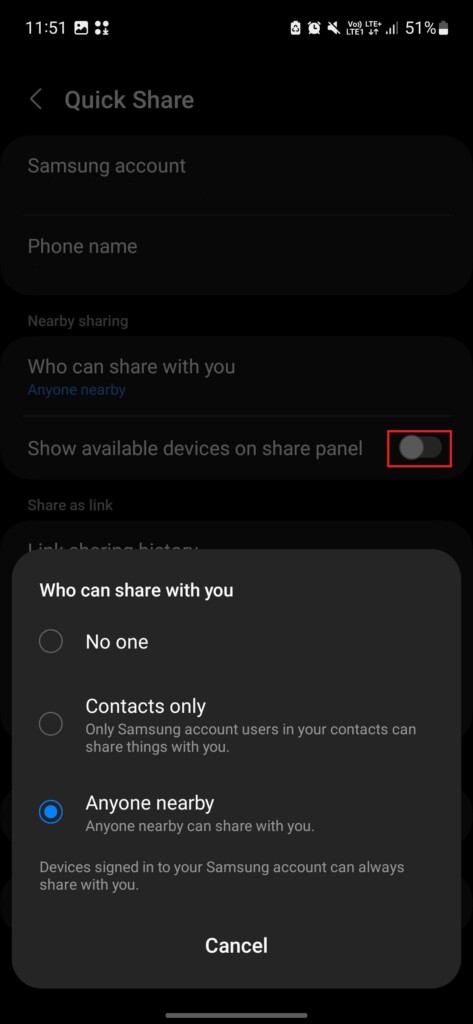 2.İçindeYakın PaylaşımBölüm, dokununSeninle kim paylaşabilirSeçenek ve listeden olanı seçin. Ayrıca, yandaki geçişi etkinleştirinMevcut Cihazları Share Panelde Göster.