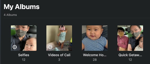 Akıllı albümler altında bulunurAlbümlerim, fotoğraflarda kenar çubuğundaki albümlerin altında. Bir fotoğraf yerine, simgesi olarak bir dişli kullanır. Göremiyorsanız, tıklamanız gerekebilirAlbümlerimgenişletmek ve içeriğini görüntülemek için. Diğer slayt gösterisi projeleriniz de burada bulunmaktadır.
