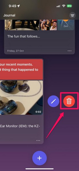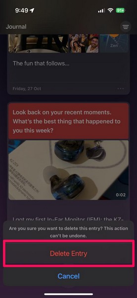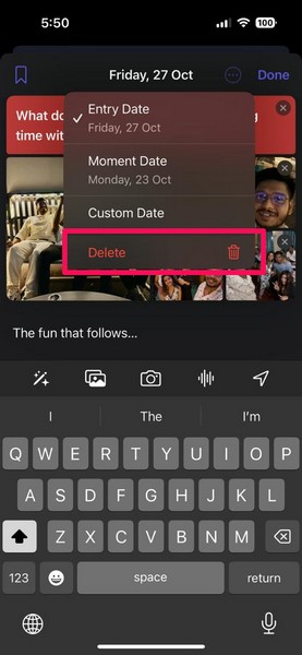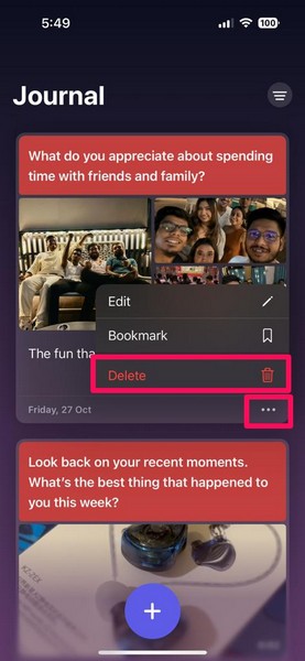 Dergi uygulamasındaki girişleri silmenin bir başka yolu daÜç noktalı düğmeye dokununsilmek istediğiniz bir giriş için veSil seçeneğini seçinBağlam menüsünden. Eyleminizi onaylayın ve seçilen günlük girişi silinecektir.