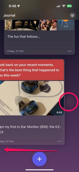 Dergi uygulamasındaki günlük girişlerini silmenin en kolay yollarından biri kaydırma yöntemidir. Bu nedenle, silmek istediğiniz girişi bulun, dokunun ve basılı tutun vesağdan sola kaydırın.