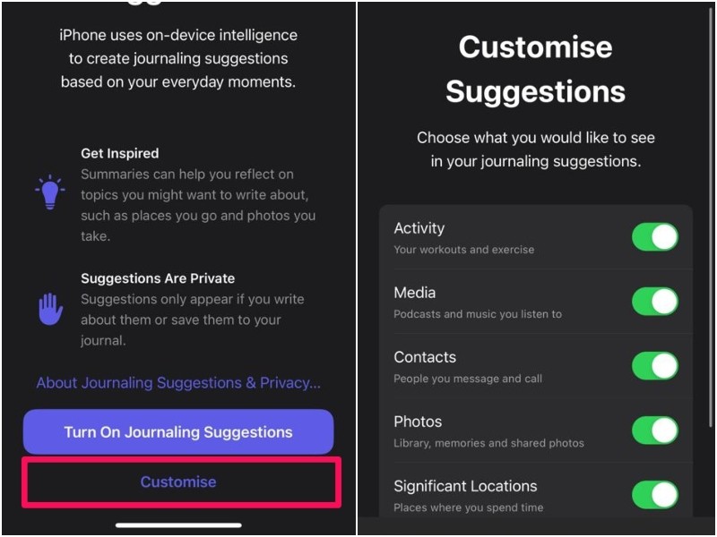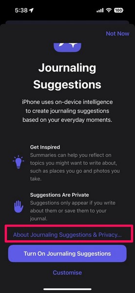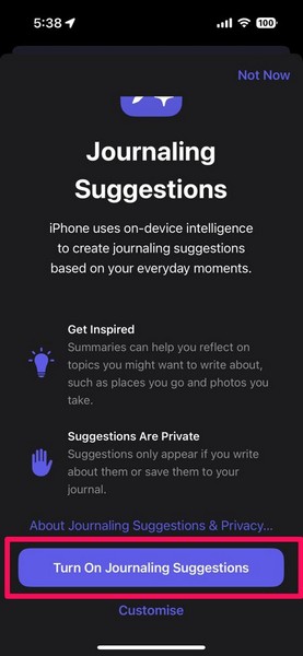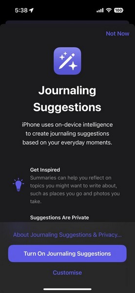 Şimdi, aşağıdaki sıçrama ekranında, günlük uygulaması size açmak isteyip istemediğinizi soracaktır.Günlük kaydı önerileriiPhone'unuzda özellik. Burada yapacaksınGünlük oluşturma önerileri hakkındaki tüm bilgileri bulunIOS 17'deki iPhone'daki dergi uygulamasında özellik.
