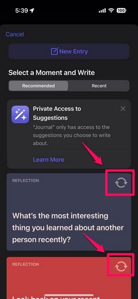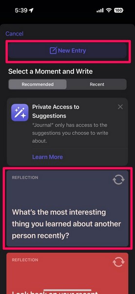 Dergi uygulamasının kurulum işlemi iPhone'unuzda tamamlandıktan sonra, uygulamadaki yeni dergi giriş ekranına yönlendirileceksiniz. Burada, sıfırdan bir giriş oluşturmak için üstteki yeni giriş seçeneğine dokunabilirsiniz. Aksi takdirde, devam etmek için sağlanan günlük önerilerinden herhangi birine dokunabilirsiniz. Bizim durumumuzda, önerilen bölümün altındaki günlük önerilerinden biriyle gittik.
