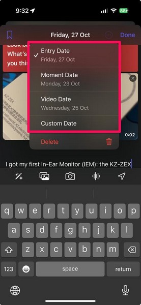 Tercih ettiğiniz medyayı günlük girişinize ekledikten sonra,Üç noktaya dokunun (daha fazla)Giriş için bir tarih seçmek için sağ üstte düğme. Dergi giriş tarihini sağlanan seçeneklerden seçebilir veya seçtiğinize göre özel bir tarih ekleyebilirsiniz.