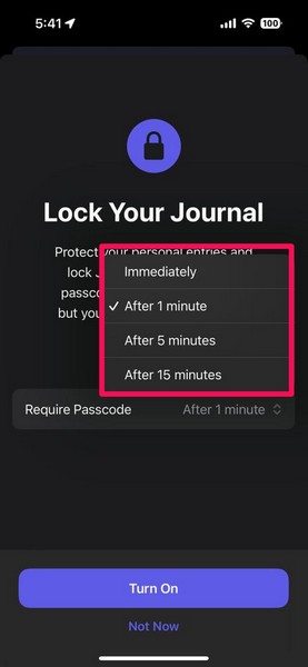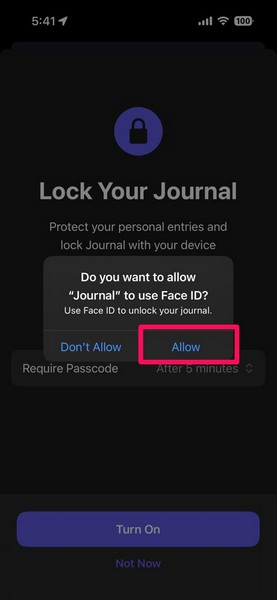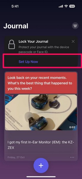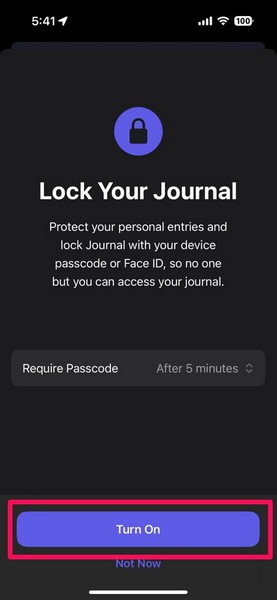 Şimdi, iPhone'unuzda iPhone'unuzdaki dergi uygulamasına ilk günlük girişinizi yaparken, uygulama günlüğünüzü kilitlemenizi önerebilir. Cihazınızdaki Journal uygulamasının ana sayfasından istemi alırsanız, bunu ayarlamak ve söz konusu uygulamayı yüz kimliğinizle kilitlemek için aşağıdaki adımları izleyebilirsiniz.