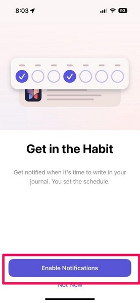 1.Ne zaman aldığınAlışkanlık içine girmekSıçrama ekranı Günlük uygulamasını başlattıktan sonra,Bildirimleri Etkinleştirdüğme.