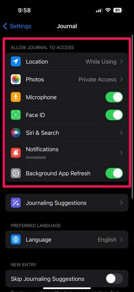 Şimdi, iPhone 17'de iPhone'unuzdaki dergi uygulamasını ayarladıktan sonra, Yüz Kimliği Korumasını Etkinleştir/ Devre Dışı Bırakmak, Bildirimleri Etkinleştir/ Devre Dışı Bırakmak, Fotoğraflara Erişime İzin Ver/ Devre Dışı Bırakmak ve Diğer Ayar Değişiklikleri Yapmak İstiyorsanız, Dergi Uygulamasının Uygulama İçi Ayarlar sayfasından bunu yapabilirsiniz.