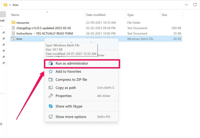 3.Şimdi,TRON'u sağ tıklayın (Windows Toplu Dosyası)Ve seçYönetici olarak çalıştırBağlam menüsünde seçenek.