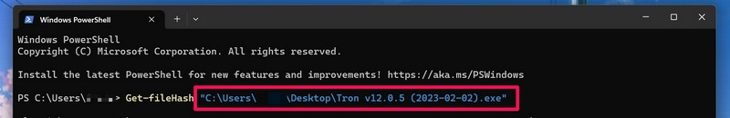 Not:Get-Filehash komutu ile (Tron Dosya Konumu) kısmı arasında bir boşluk vardır.