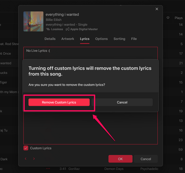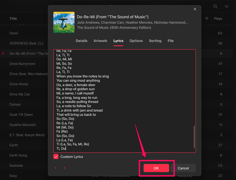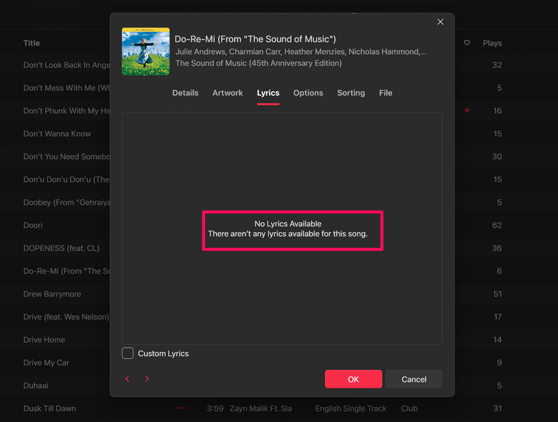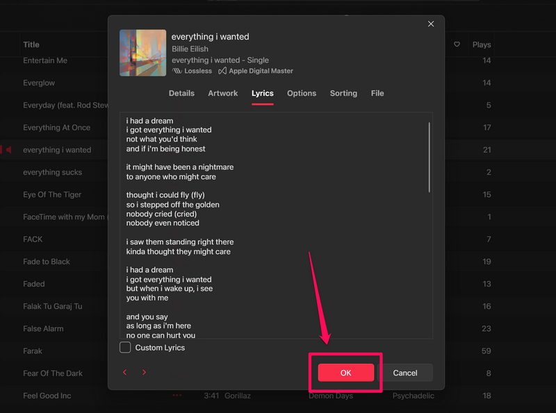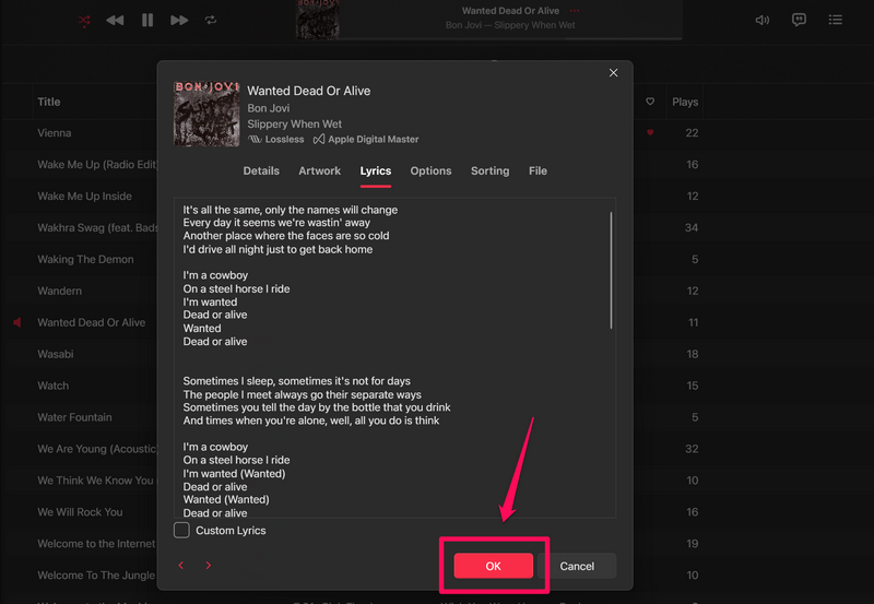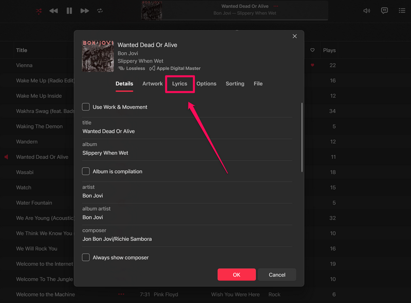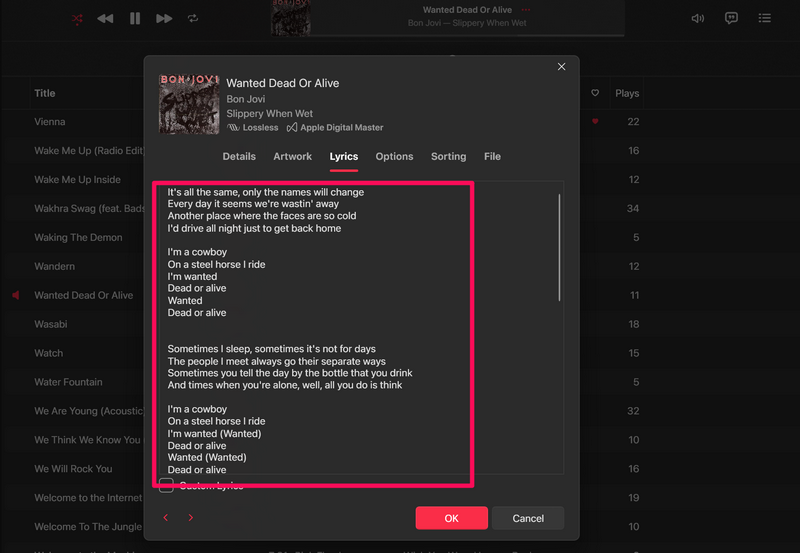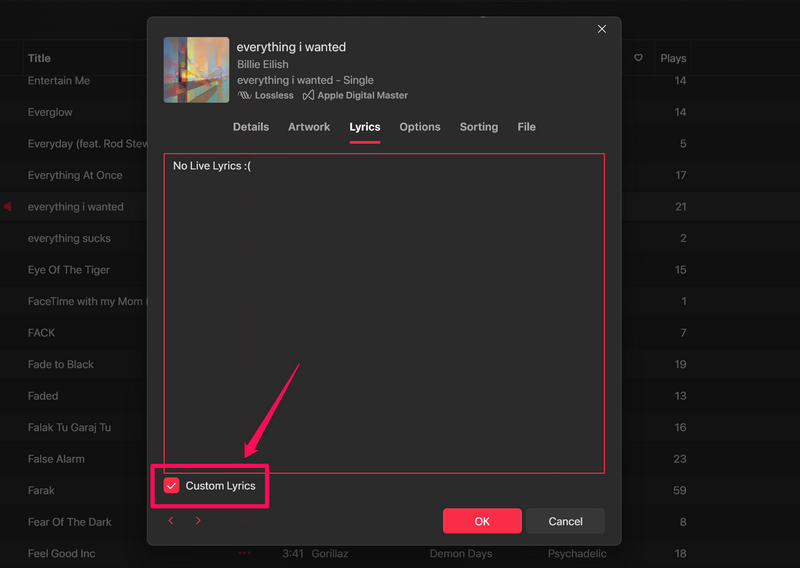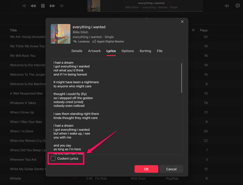 13.Yani, eğer istersenBir şarkı için özel şarkı sözleriApple Music uygulamasında,Şarkı Sözü sekmesine gitŞarkının özellikleri penceresinde veÖzel Şarkı Sözleri seçeneğinin kutusunu işaretleyinoradan.