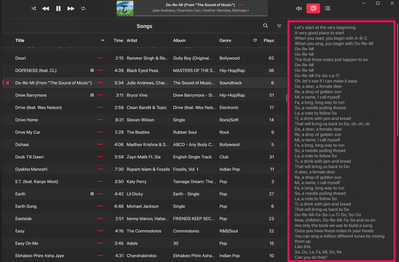 5.Panelde yapabilirsinizşarkı sözlerinin vurgulanmasını görŞarkı ilerledikçe. Ayrıca olacakotomatik olarak kaydırınVe şarkının şu anki şarkı sözlerini görünümde tutun.