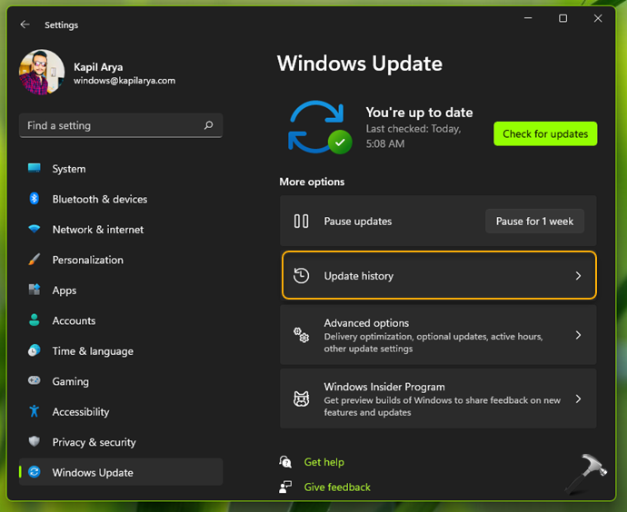 2.Gidip gelmekWindows Güncellemesi. Sağ bölmede tıklayınGeçmişi Güncelle.