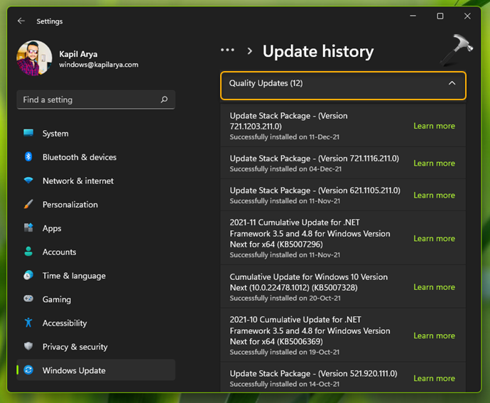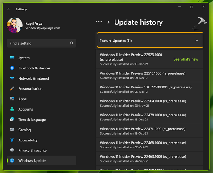3.Güncelleme geçmişi altında, yüklü güncellemeler ait oldukları türe göre sınıflandırılır. Aşağıdaki ekran görüntüsü, özellik güncellemelerinin nasıl gösterildiğini gösterir.