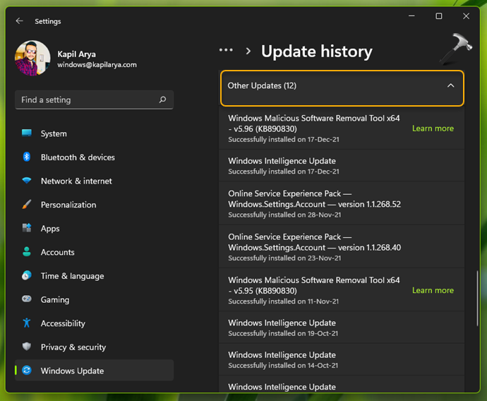 Güncelleme geçmişinin sonunda, sisteminize yüklü başka güncellemeler bulacaksınız.