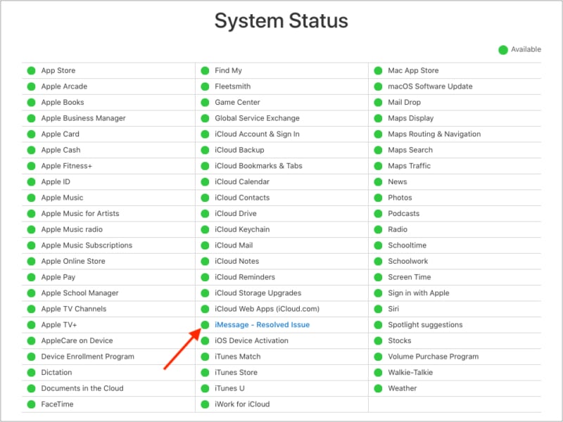 Bazen sorun Apple'ın sonunda. Ziyaret etmekApple'ın Sistem Durum Sayfasıve iMessage'ı kontrol edin. Sarı veya kırmızı ise, Apple sorunu çözene kadar beklemeniz gerekecek.