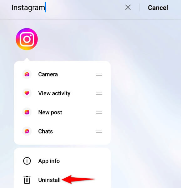 - Dokunun ve tutunInstagramUygulama çekmecenizde ve seçinKaldırmak.
