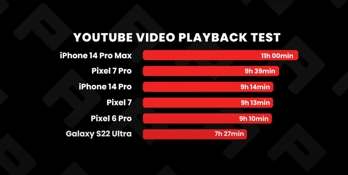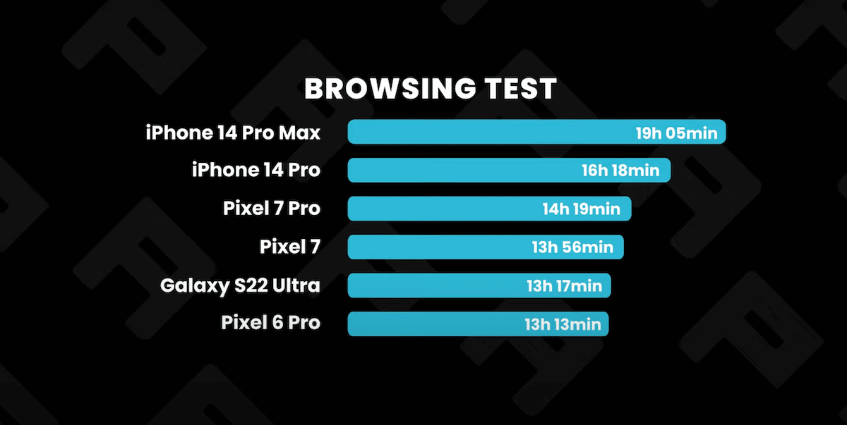 Ayrıca test, iPhone 14 Pro'nun Galaxy S22 Ultra, Pixel 7 Pro ve Pixel 6 Pro'dan daha iyi pil ömrü sunduğunu ortaya koyuyor.