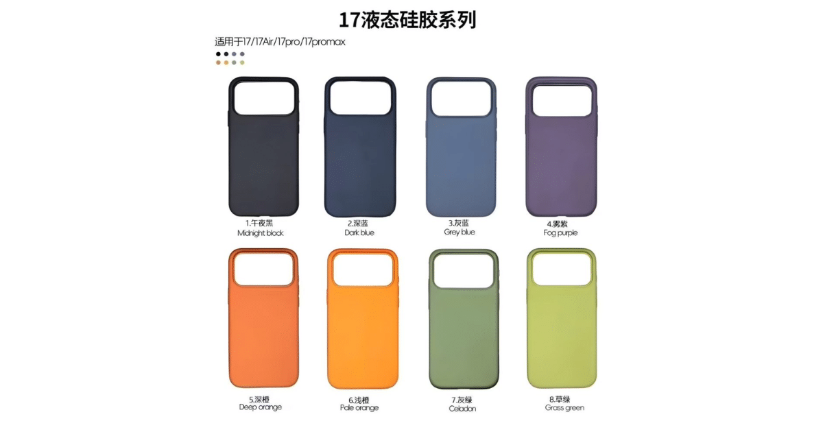 Sızıntılara göre, iPhone 17 sıvı silikon kılıfı sekiz resmi renkte mevcut olacak: derin turuncu, soluk turuncu, çim yeşili, celadon, sis mor, gri mavi, koyu mavi ve gece yarısı siyah. Bu palet, canlı tonları daha bastırılmış klasiklerle birleştirerek, cesur bir şey tercih eden kullanıcılara ve sade tonları tercih edenlere hitap eden bir karışım sunar.