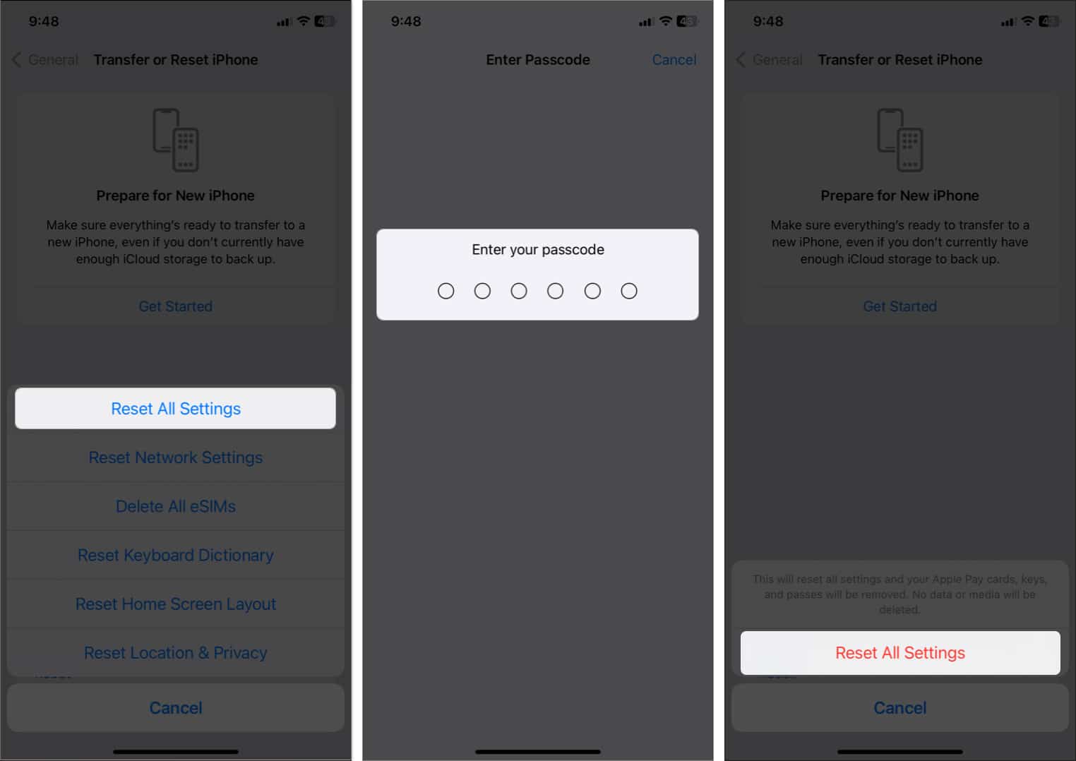 İPhone ayarlarınızı sıfırlamak için açınAyarlar. Sonra gitGenel→İPhone'u aktarın veya sıfırlayın→Sıfırlamak→Tüm ayarları sıfırla. Şimdi iPhone Passcode'unuzu girin ve dokununTüm ayarları sıfırlaSeçiminizi onaylamak için.