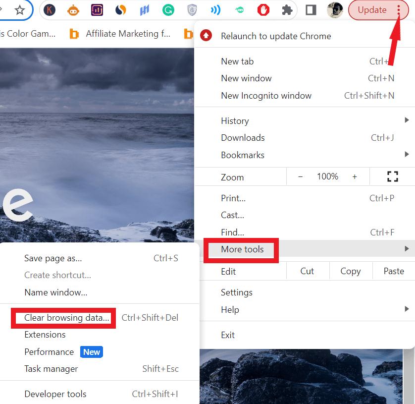 - Açılır menüden seçin."Daha fazla araç"ve daha sonra"Göz atma verilerini temizleyin."
