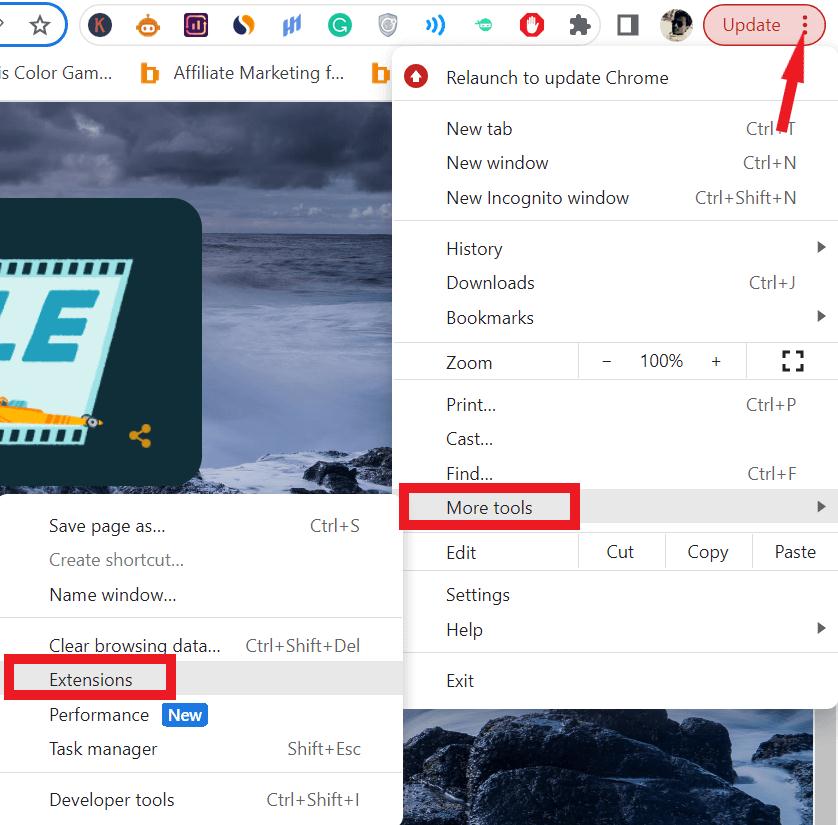 - Açılır menüden seçin."Daha fazla araç"ve daha sonra“Uzantılar”.
