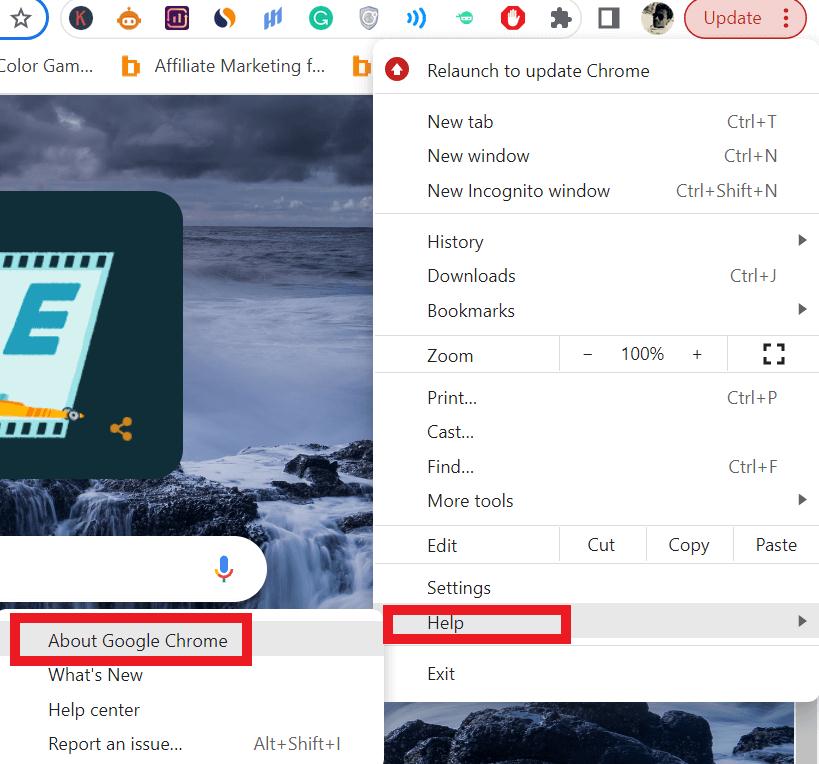 - Açılır menüden seçin."Yardım"ve daha sonra"Google Chrome hakkında."