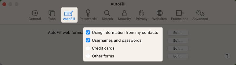 Daha sezgisel bir deneyim sağlamak için Safari, Mac'inizde depolanan bilgileri kullanarak çevrimiçi olarak algılanan formları tamamlayan bir otomatik doldurma işlevine sahiptir. Dezavantajı, bunun bazen safarinin etiketlemesine neden olabileceğidir.