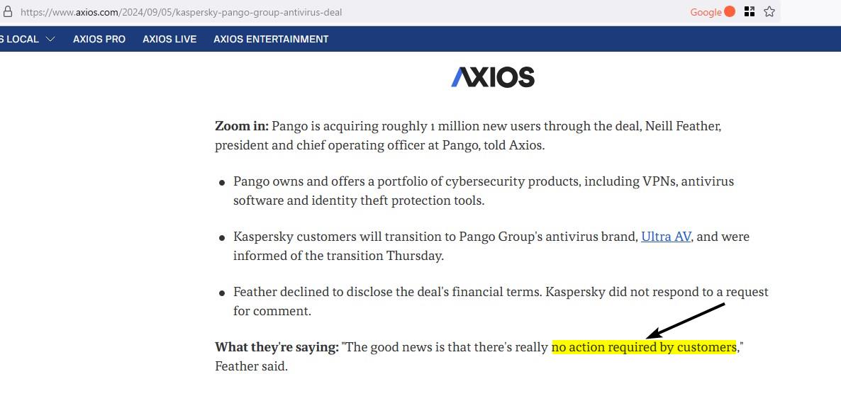 Bu muhtemelen Kaspersky'nin ABD tarafından belirlenen kısıtlamaları ortadan kaldırma yolu, doğrudan bir ürün değil, üçüncü bir tarafa da entegre değil. Ama kesinlikle tüketicinin bakış açısından iyi bir anlaşma değil.