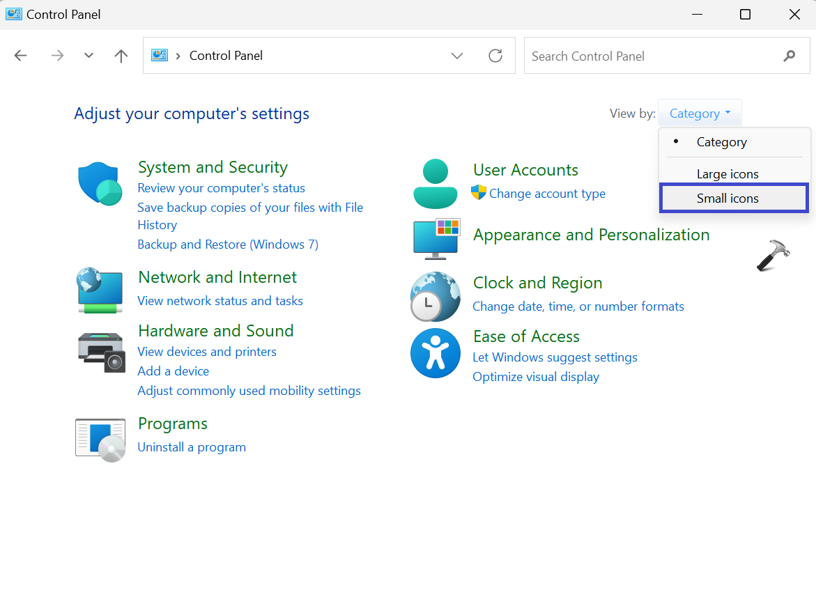 1. Kontrol panelini açın. Görüntüle ve küçük simgeleri seçin.