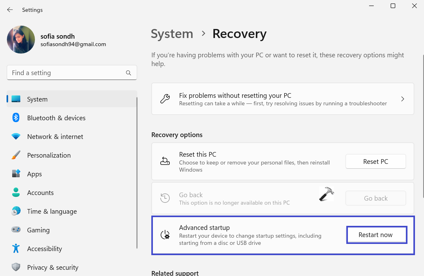 2. Şimdi, kurtarmaya gidin ve şimdi yeniden başlatmayı seçin.