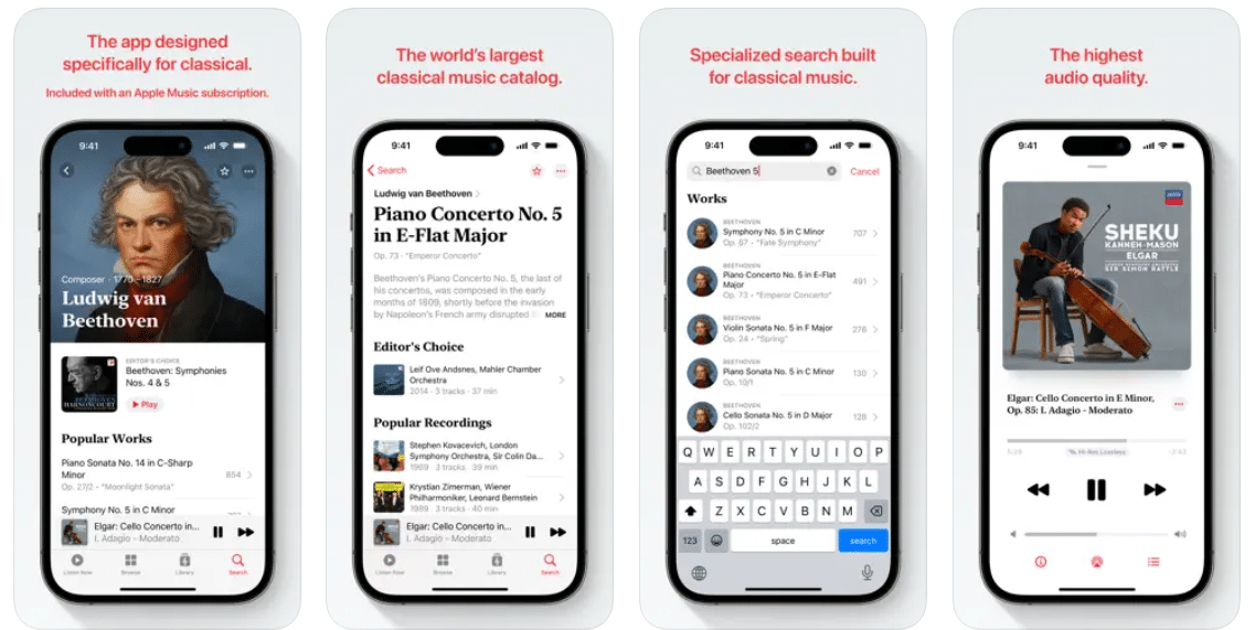 TechCrunchraporlarYeni uygulamanın Apple Music abonelerinin yeni yüksek kaliteli sürümlerin yanı sıra yüzlerce küratörlü çalma listesi, binlerce özel albüm ve besteci BIOS ve Deep Dives gibi diğer özelliklere de dahil olmak üzere beş milyondan fazla klasik müzik parçasına erişim sağlayacağını. Uygulama, kullanıcıların besteci, iş, şef, katalog numarası ve daha fazlası tarafından arama yapmalarına izin vererek, özellikle klasik müzikle etkileşim kurmak için daha basit bir arayüz sunacaktır.