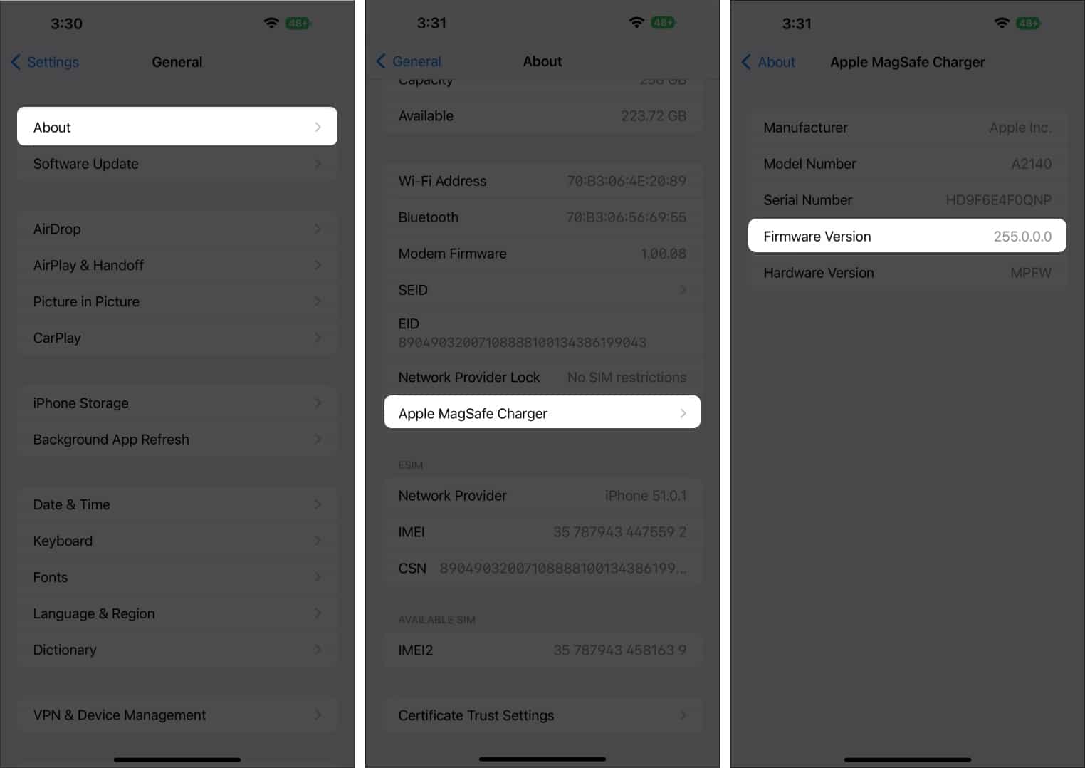 Ürün yazılımı güncellemesini indirmenin kesin bir yolu olmasa da, MagSafe şarj cihazınızın hangi ürün yazılımı sürümünü ve model numarasını bulabilirsiniz. Ama devam etmeden önce,MagSafe şarj cihazının iPhone'a bağlı olduğundan ve bir güç kaynağına takıldığından emin olun.