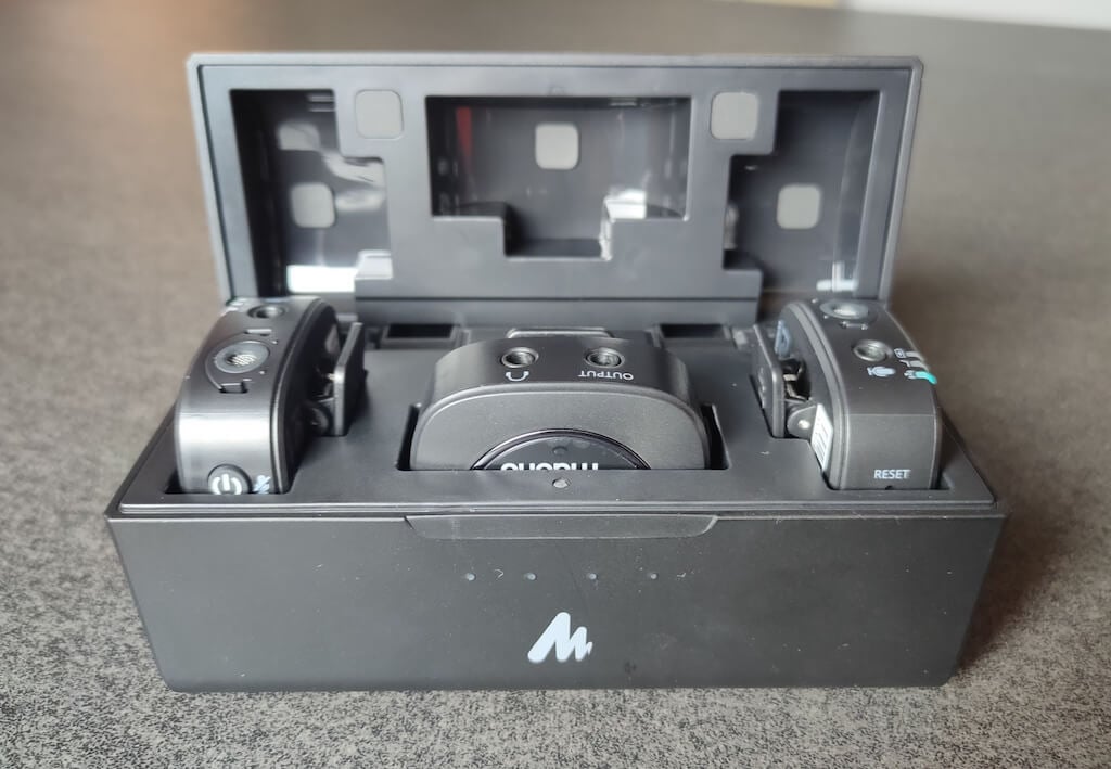 WM821'in 10 saate kadar çalışmanın mükemmel pil ömründen daha önce bahsettik. Maono'ya göre, vericiler daha da uzun sürebilir - tek bir şarjla 12 saate kadar. Şarj durumu sayesinde, gerçek bir şarj cihazı kullanmadan önce bu sayıları iki katına çıkarabilirsiniz.