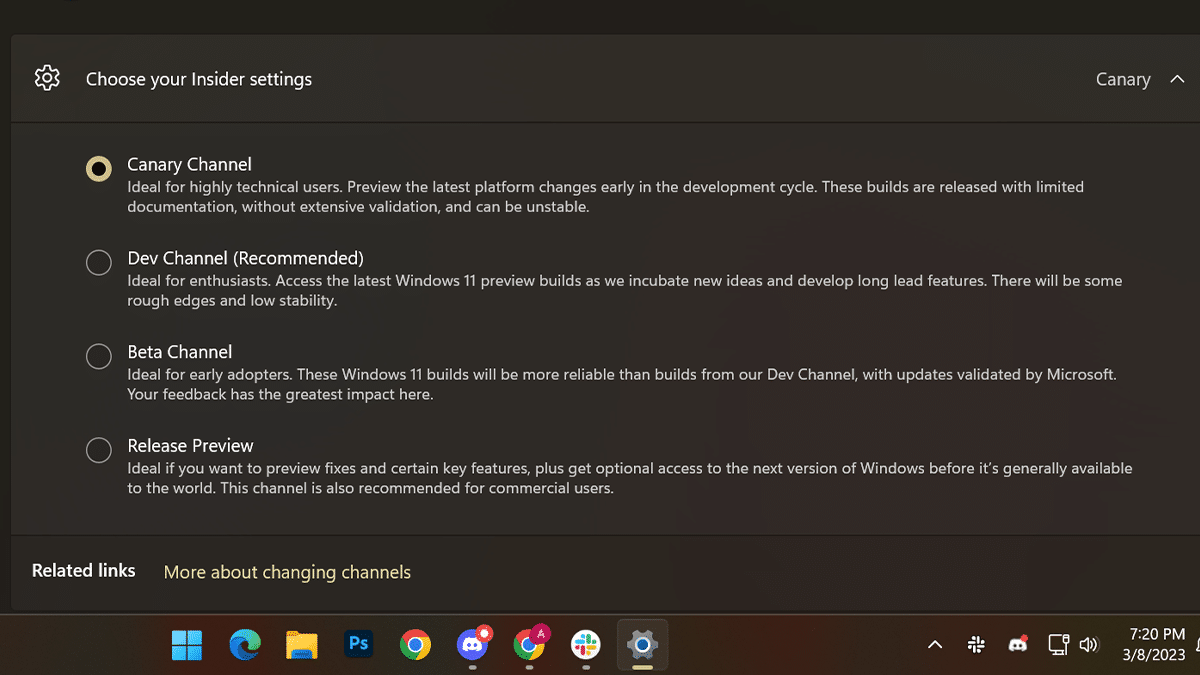 Bu arada, geliştirici kanalı “yeniden başlatılıyor”, ancak henüz büyük bir değişiklik yok. Bu, belirli bir OS sürümüne bağlı olmayan yeni özellikleri denemeye istekli olan Windows meraklıları içindir.