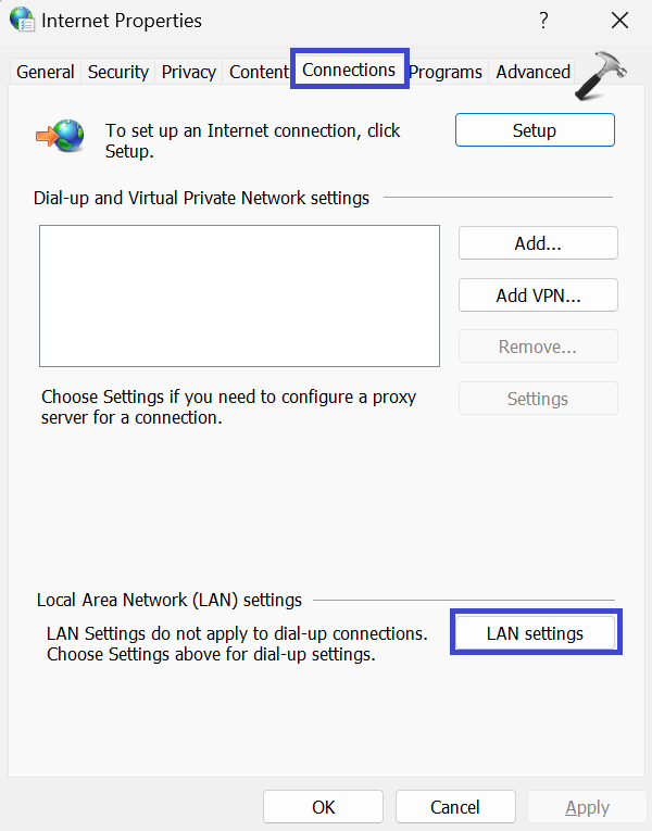 2. İnternet özellikleri iletişim kutusu görünecektir. GitBağlantısekme ve seçin "LAN Ayarları".