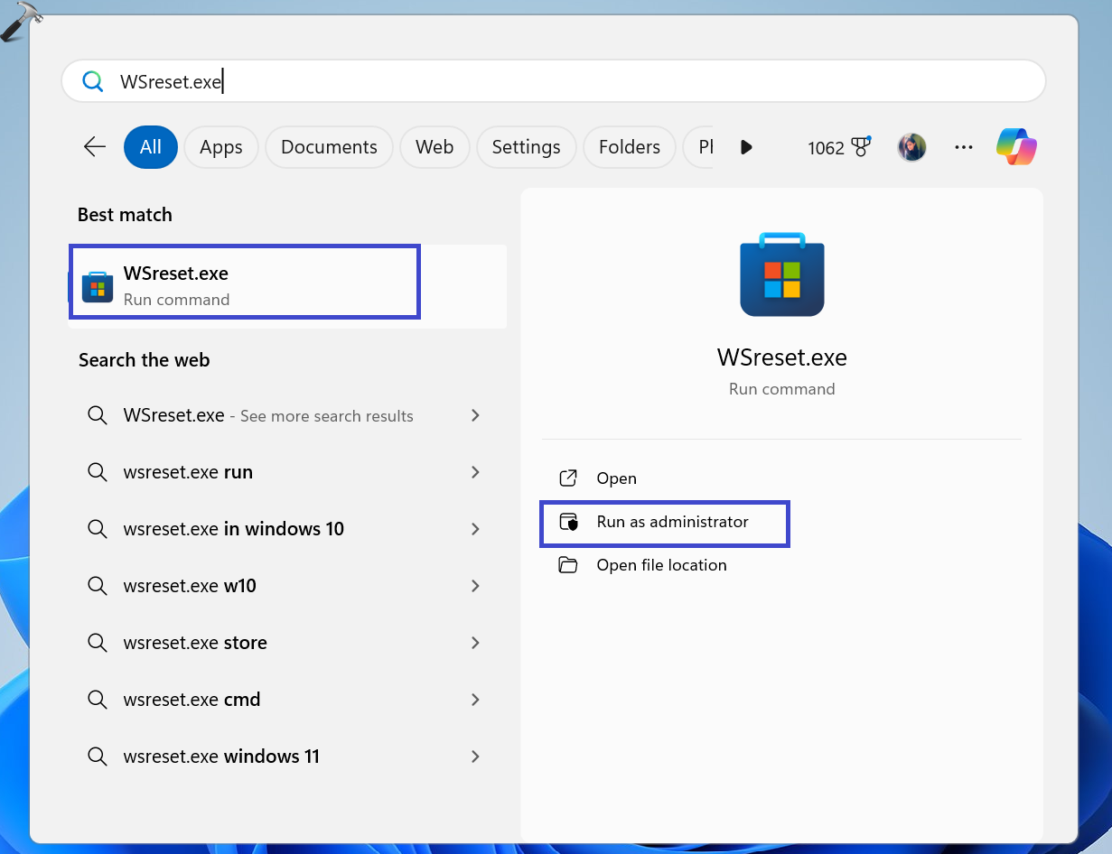 1. Arama menüsünü açın ve yazınWsreset.exe".