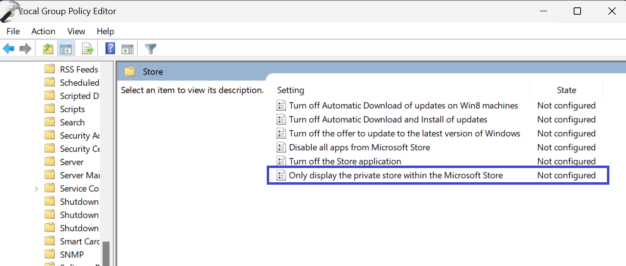 4.Yalnızca Microsoft Mağazası'nda özel mağazayı görüntüleyin”Politika. Bu politika, kullanıcıların yalnızca özel mağazaya veya Microsoft mağazasındaki tüm perakende kataloğuna erişip erişemeyeceğini kontrol etmenizi sağlar.