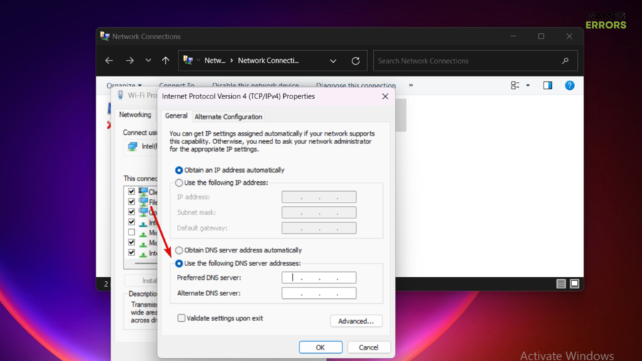 6. İçindeTercih edilen DNS SunucusuSeçenek, şunu ayarlayın: 8.8.8.8. O zaman,Alternatif DNS SunucusuAşağıdakileri ayarlayın: 8.8.4.4.