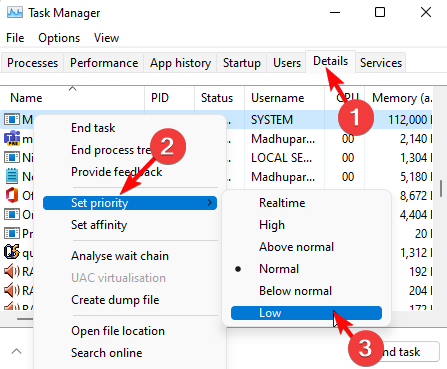 - İçindeGörev yöneticisiPencere, Ayrıntılar sekmesini seçin. Burada, oyununa sağ tıklayın, seçinÖnceliği belirleyinve düşük tıklayın.