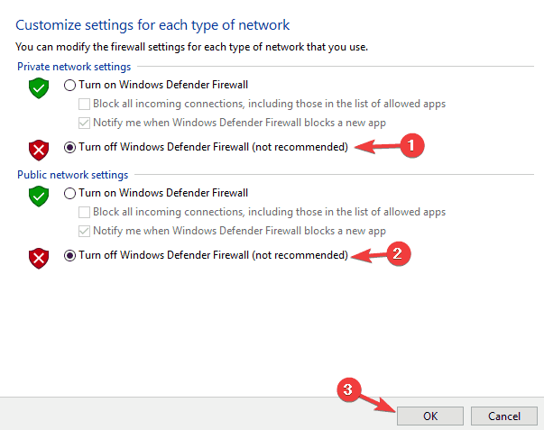 - SeçmeHem özel hem de genel ağ ayarları için Windows Defender Güvenlik Duvarı'nı (önerilmez) kapatın.
