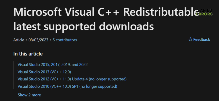 3. Orada, bir liste bulacaksınızMevcut Visual C ++ Yeniden Dağıtılabilir Paketler.