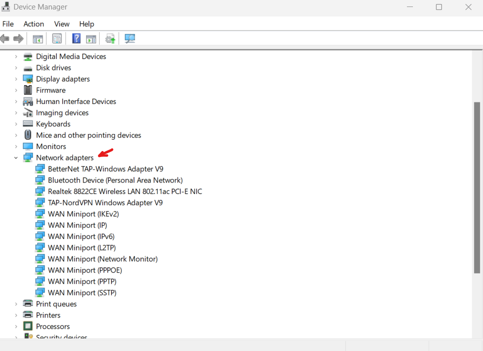 TıklamakAğ bağdaştırıcılarıBağlam menüsünden kategoriyi genişletmek için. PC'nize yüklü tüm ağ sürücülerinin bir listesini alacaksınız.