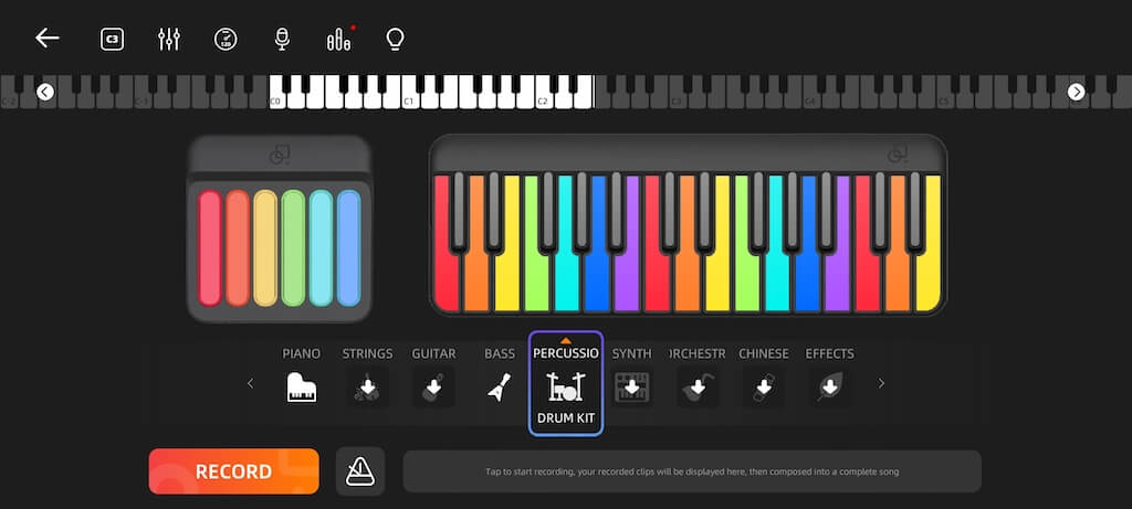 Bu aynı zamanda güçlü akor pedinin devreye girdiği yerdir. Birincil işlevi, standart bir dijital klavyede bulunan akor tuşlarını değiştirmek olsa da, onunla yaratıcı olabilirsiniz. Örneğin, FreePlay bölümünde, klavyenin sesini piyanodan davullara değiştirin ve akor pedini davul pedi olarak kullanın.